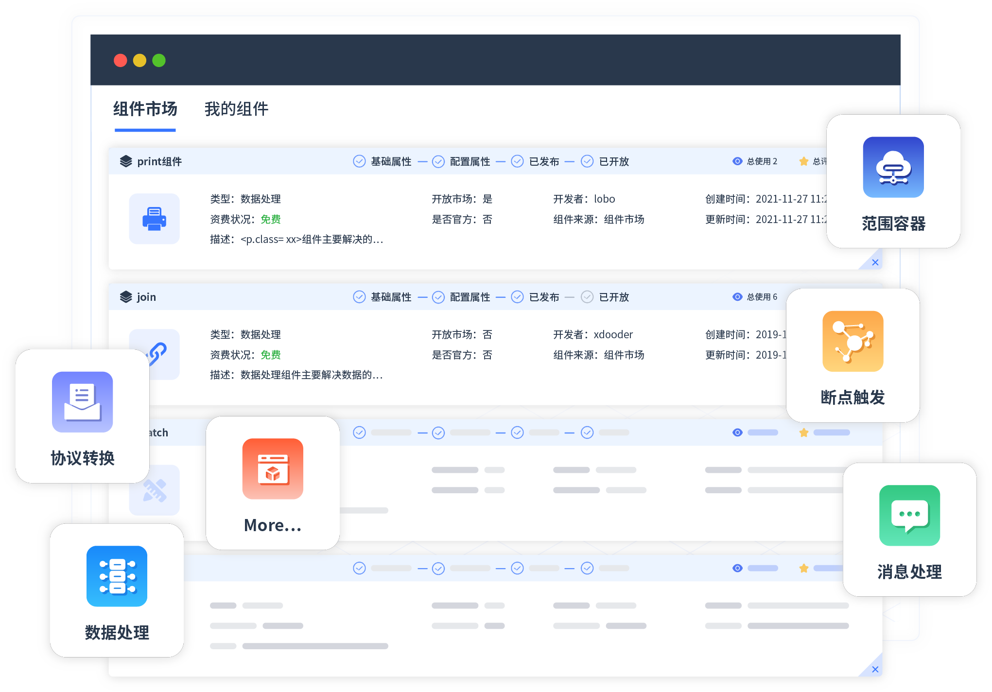 针对集成场景,,,,钱能钱包提供组件市场,,例如协议转换、、消息处理、、、文件操作等。。。除平台提供的组件外,,,,客户可以自定义所需组件。。。