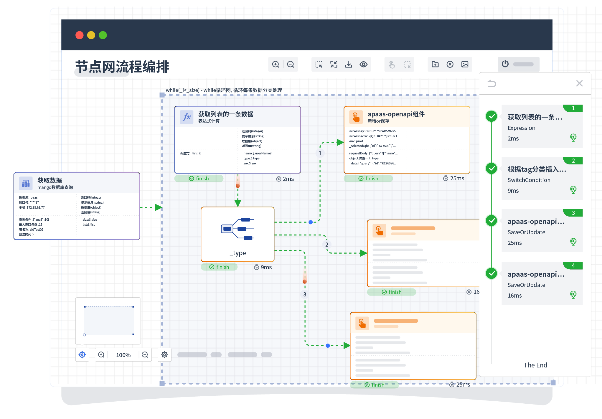 针对集成场景,,,,组件定义后支持进行流程编制,,,,不同于传统代码方式,,,通过图形化展示,,,支持在线调试、、日志查看和运行回放。。
